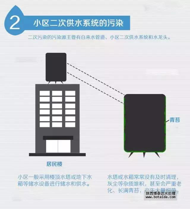 小區(qū)一般采用樓頂水塔或地下水箱等儲水設(shè)備進行儲水和供水。而水塔或水箱常常沒有及時清理,灰塵等雜質(zhì)堆積。有的儲水設(shè)備甚至?xí)乐乩匣?、長滿青苔,產(chǎn)生大量細菌滋生。