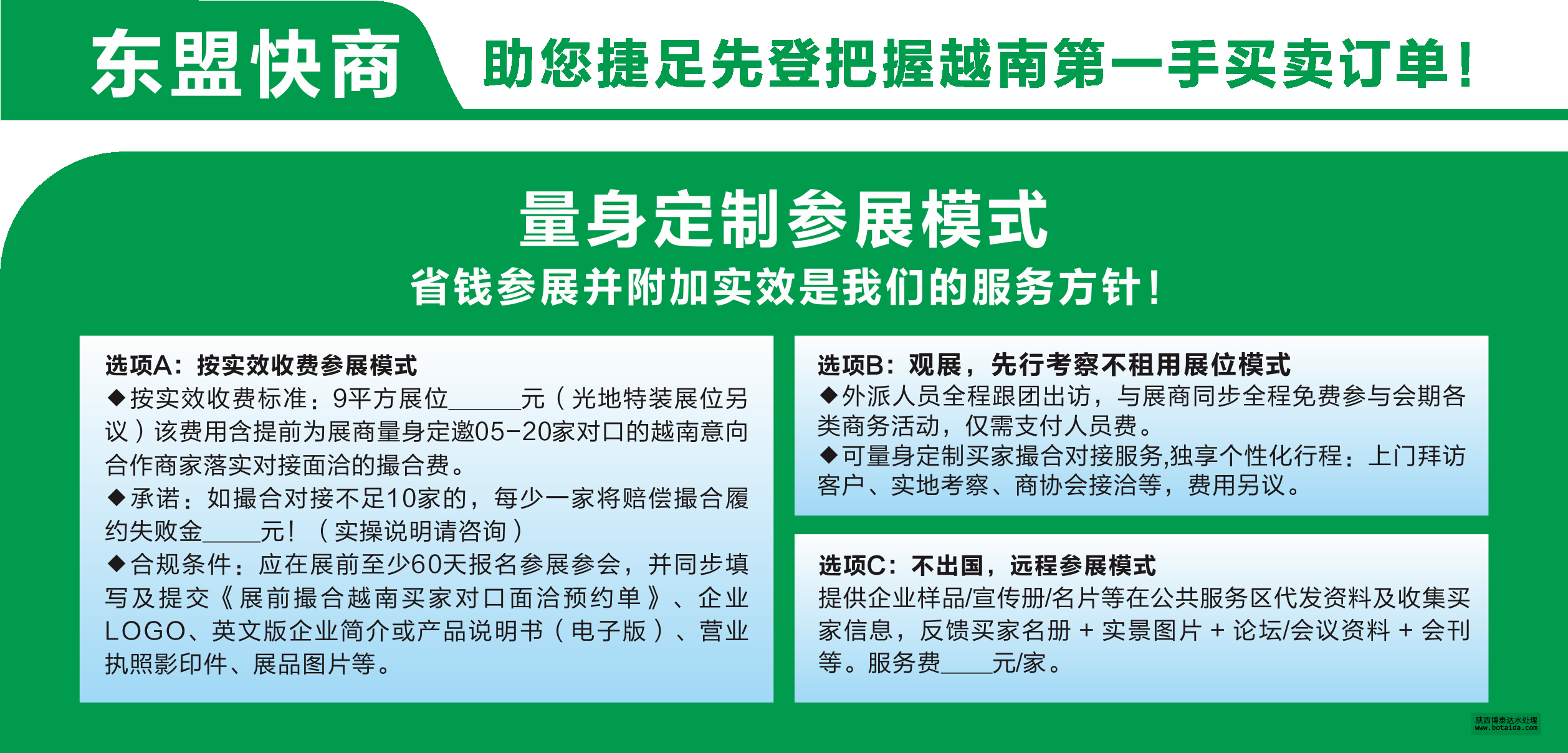 合規(guī)條件:應(yīng)在展前至少60天報名參展參會,并同步填寫及提交《展前撮合越南買家對口面洽預(yù)