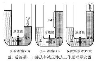 正滲透膜技術(shù)屬于膜分離過(guò)程。水從高水化學(xué)勢(shì)區(qū)通過(guò)選擇性滲透膜向低水化學(xué)勢(shì)區(qū)進(jìn)行轉(zhuǎn)移。選擇性滲透膜分隔的高水化學(xué)勢(shì)區(qū)和低水化學(xué)勢(shì)區(qū)所存在的滲透壓差是正滲透過(guò)程的驅(qū)動(dòng)力。正滲透技術(shù)具有低能耗、較高的水通量和回收率、不易結(jié)垢和可處理高濃鹽水等優(yōu)點(diǎn)。