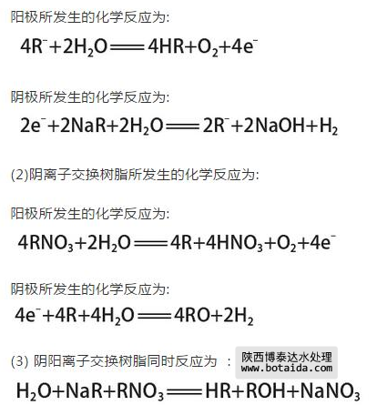 在利用滲析的極化過(guò)程中,由于在水溶液中會(huì)產(chǎn)生H+和OH-,使樹(shù)脂在化學(xué)反應(yīng)中進(jìn)行電化學(xué)再生,這對(duì)水質(zhì)的提升具有正面的影響,而在再生的過(guò)程中,如果不進(jìn)行離子交換處理,就會(huì)造成水質(zhì)變壞,這樣就需要采用適宜的工作環(huán)境,才能達(dá)到提高水質(zhì)的要求,采用EDI裝置的離子交換樹(shù)脂技術(shù),可以有效的提高水質(zhì)。具體的化學(xué)反應(yīng)方程式如下,