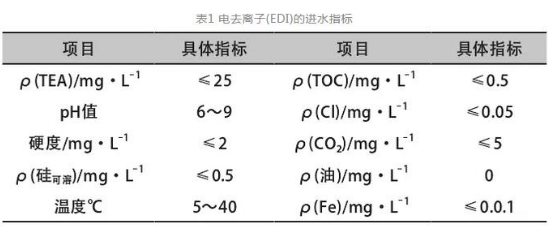 EDI 裝置在電廠中得到了廣泛的應(yīng)用,它屬于較為精細(xì)的水處理系統(tǒng),在水處理的過(guò)程中,必須要求進(jìn)水有較高水質(zhì),才能滿足處理的要求。在一般情況下EDI 對(duì)進(jìn)水水質(zhì)的要求具體如表1 所示,主要采用RO 作為火電廠的廢水預(yù)脫鹽軟化處理設(shè)備。