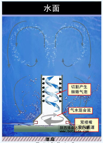 旋流曝氣器在工作過程中,氣體從底部法蘭口進入后從緊貼鐘型曲面的 2 個噴嘴噴出形成旋流效果,以極快的速度沿著鐘型壁面向上加速回旋。由于鐘型上側漸漸狹窄,空氣獲得極大的加速度和沖擊力。 由于氣體作用,混合液在筒內、外循環(huán)流動,氣液上升過程中,被筒內部結構多次碰撞切割,形成大量超微氣泡,且與周圍的泥水混合物充分混合,增加了氧氣的傳質速率和氧利用率;充分混合的氣水猛力向上沖出,強烈的循環(huán)水流使部分小氣泡和水流返回池底,同時使底部淤泥參與循環(huán),因而整個曝氣池內無充氧盲區(qū),實現了曝氣池容積利用最大化。(見圖3)
