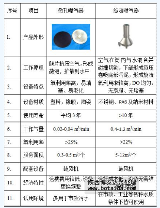 由于兩種曝氣設備的工作原理、生產材質不同,故兩種曝氣器在性能上有很多不同點。具體不同點見表1。