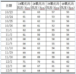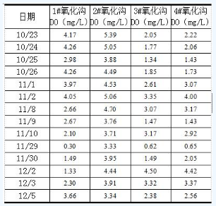 本項目于2017年9月底正式完成改造工程。其中1#、2#氧化溝采用了停水清池,底部安裝固定的方式,安裝了新的微孔曝氣器,3#、4#氧化溝采用了帶水作業(yè)的方式,安裝了新的旋流曝氣器。具體運行數據見表2、 表3。