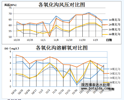 旋流曝氣器會卷吸起底部的泥水混合物,旋流曝氣器會將藏在底部污泥中的部分有機物進一步消化分解,故在運行初期,旋流曝氣器產生的一部分溶解氧用來消解底部的污泥。故在運行初期,安裝旋流曝氣器的3#、4#氧化溝溶解氧不高。隨著旋流曝氣器的穩(wěn)定運行,池底堆積的污泥進一步消解,氧化溝中額溶解氧進一步上升。博泰達預測,在未來數月內,3#、4#氧化溝內的溶解氧會繼續(xù)上升,直至底部污泥消解殆盡。