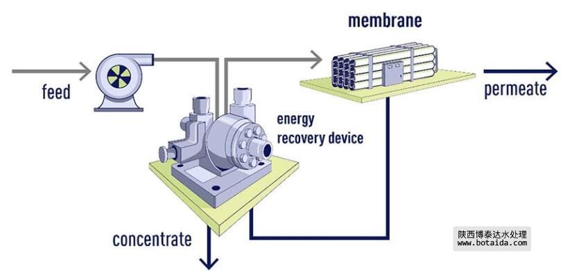 圖2:帶能量回收裝置的反滲透膜系統(tǒng)的工藝流程圖