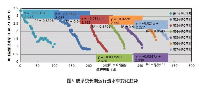 ① 透水率穩(wěn)定性透水率(J25/△P)是衡量膜滲透性能的主要指標(biāo)。以透水率隨運(yùn)行時(shí)間的衰減速率作為膜系統(tǒng)運(yùn)行穩(wěn)定性的評價(jià)指標(biāo),方法是:通過線性擬合分析得到每次維護(hù)性清洗(MC)后的起始透水率,再將每個(gè)恢復(fù)性清洗(RC)周期內(nèi)的起始透水率進(jìn)行線性回歸得到每個(gè)RC周期內(nèi)的透水率衰減速率,見圖3。