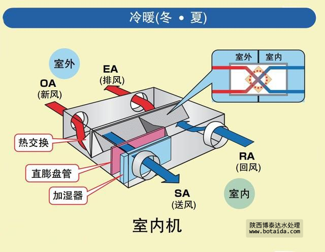 主要部分就是全熱交換機(jī)(機(jī)內(nèi)有過濾裝置),作用就是將室外空氣吸入經(jīng)過過濾和要排出的空氣進(jìn)行熱量交換,使得新風(fēng)口出來的空氣與室內(nèi)溫度溫差不大,從而達(dá)到舒適度和能耗上良好的效果。